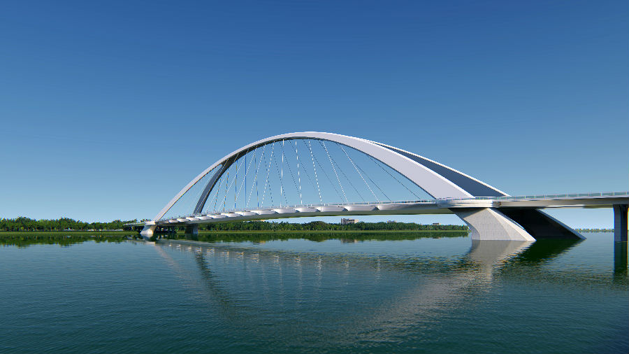 “撫音悅迎八方客,砥礪奮進謀新篇”,寓意綿陽科技城在現(xiàn)代化建設歷程中,以開放、包容的姿態(tài)不斷迎接著新事物,開拓創(chuàng)新,與時代接軌互聯(lián)?!皳崆僮V韻”為主跨243m提籃拱,主拱猶如張開的風琴般奏出美妙的音樂,簡約唯美。兩翼出挑的人行道猶如張開的雙臂,豐富行人感官體驗,與主拱共同譜寫出一曲浪漫的現(xiàn)代樂章,全橋視覺通透性好,有著強烈的韻律感。