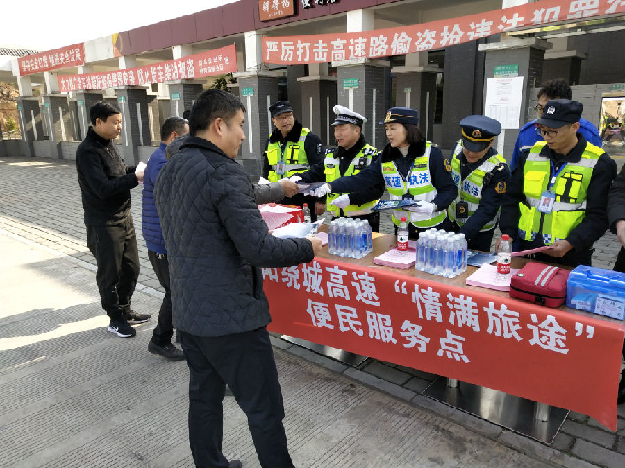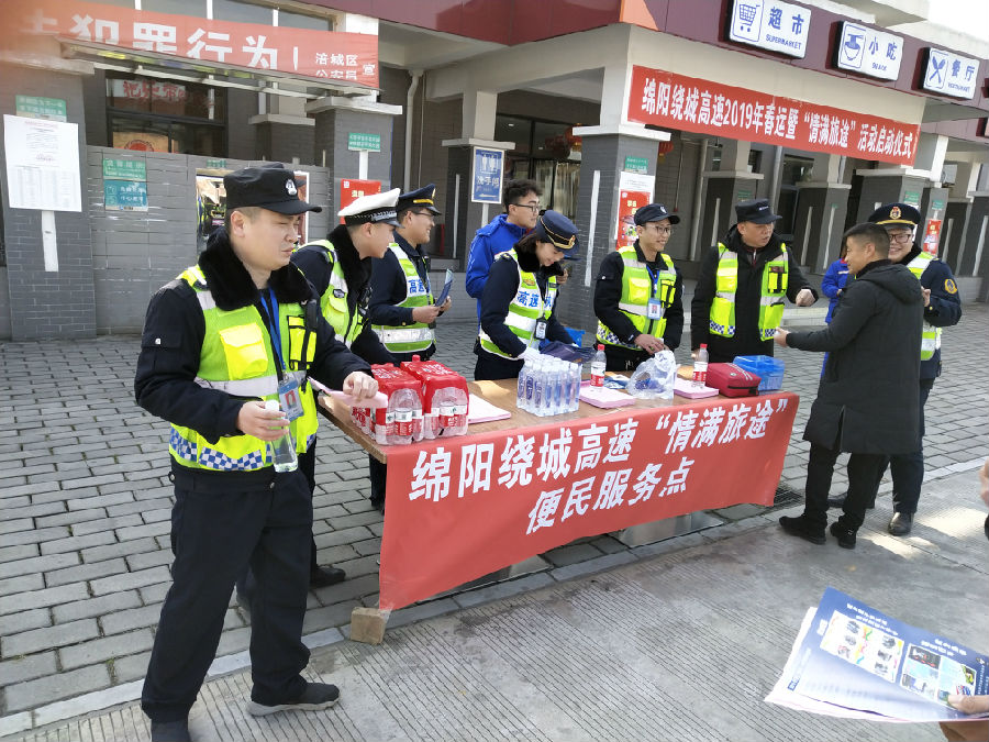 1 月 21 日,綿陽繞城高速管理所聯(lián)合高速交通執(zhí)法、高速交警 在綿陽南服務(wù)區(qū)舉行了綿陽繞城高速 2019 年春運(yùn)暨“情滿旅途” 活動啟動儀式。儀式現(xiàn)場設(shè)立了“春運(yùn)安全 情滿旅途”宣傳點(diǎn) 和便民服務(wù)點(diǎn),積極開展了咨詢引導(dǎo)、秩序維護(hù)、便民利民、應(yīng) 急救護(hù)等便民服務(wù)工作,主動為過往司乘人員特別是農(nóng)民工提供 開水藥品、交通咨詢、車輛維修、應(yīng)急救援等暖心服務(wù),充分讓農(nóng)民工兄弟感受到回鄉(xiāng)返崗旅途的溫暖,增進(jìn)了人民群眾對綿陽 繞城高速春運(yùn)服務(wù)的獲得感和認(rèn)同感。為確保綿陽繞城高速春運(yùn) 期間安全營運(yùn)奠定了堅(jiān)實(shí)的基礎(chǔ)。
