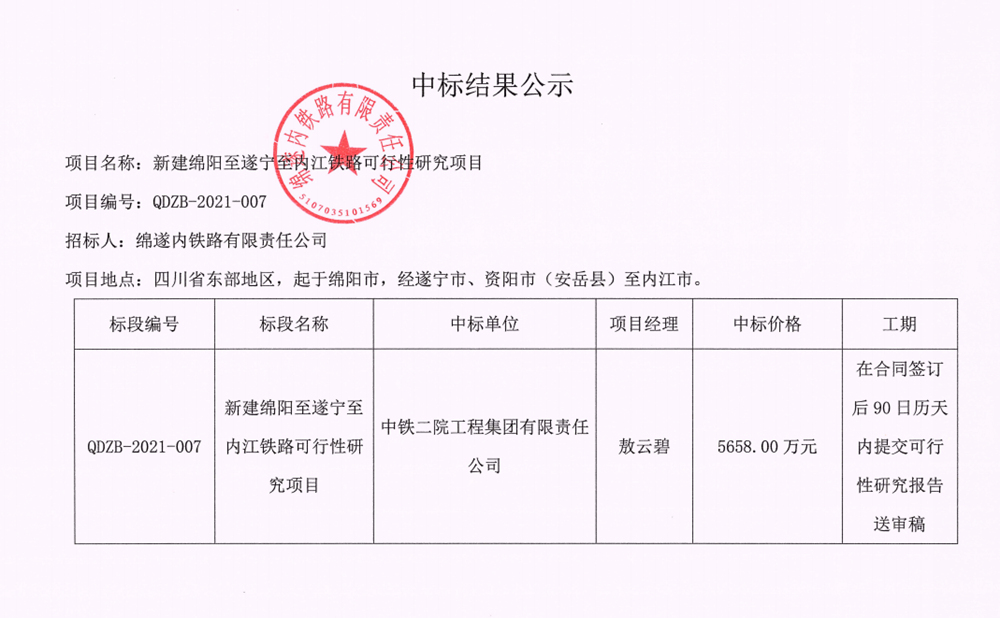 新建綿陽(yáng)至遂寧至內(nèi)江鐵路可行性研究項(xiàng)目中標(biāo)結(jié)果公示