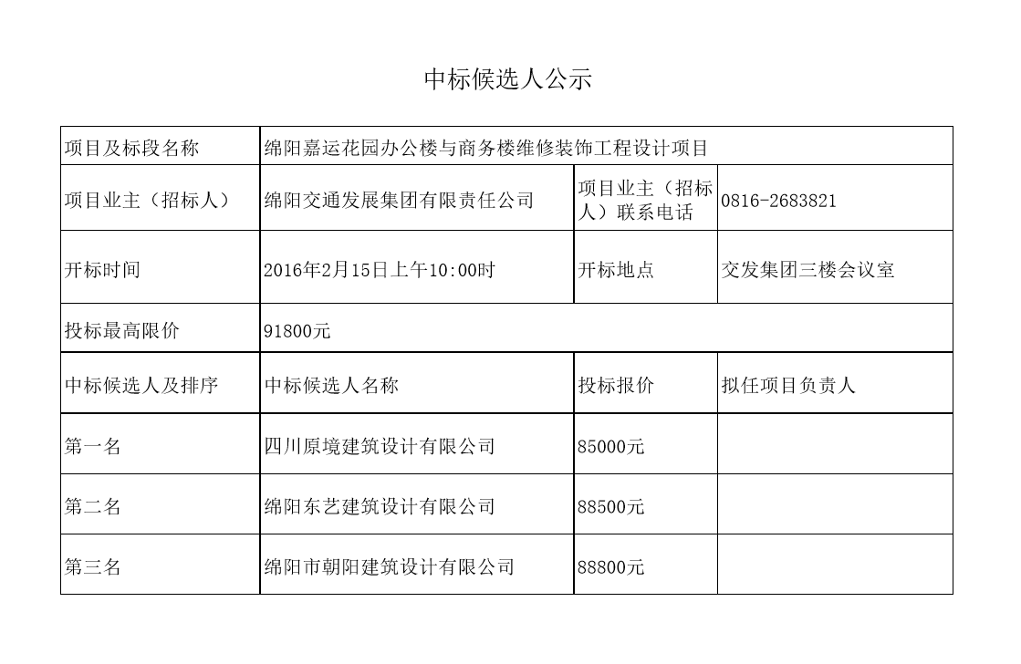 綿陽嘉運(yùn)花園辦公樓與商務(wù)樓維修裝飾工程設(shè)計(jì)項(xiàng)目中標(biāo)候選人公示