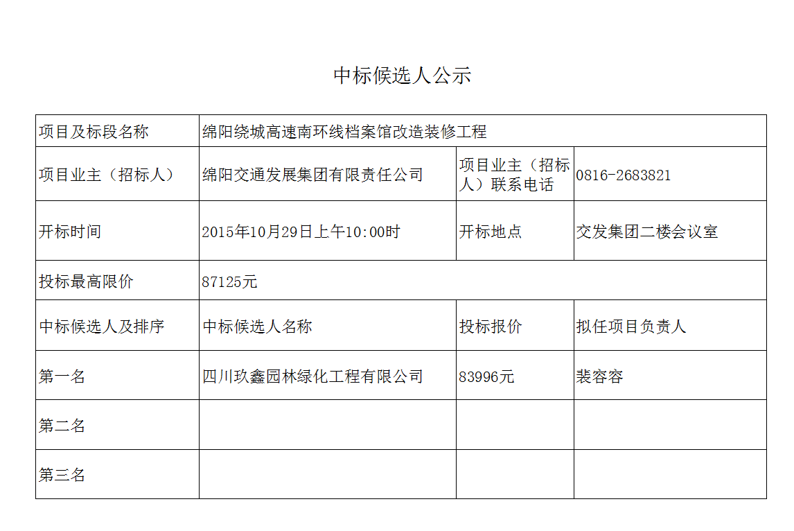 綿陽繞城高速南環(huán)線檔案館改造裝修工程中標(biāo)候選人公示