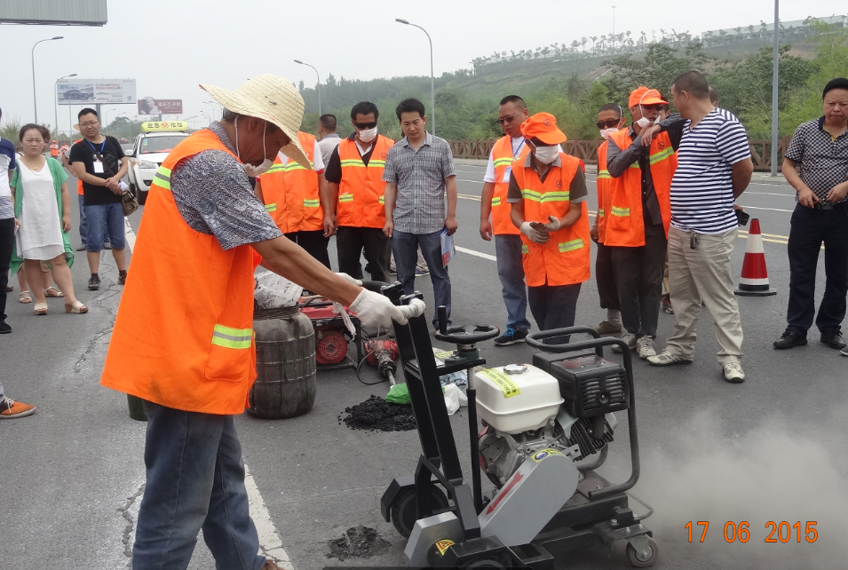 上午十點,來自各縣、市、區(qū)公路管理所、養(yǎng)護公司四十多名參會代表在市交通運輸局公路管理處的組織下來到九嶺養(yǎng)護站管養(yǎng)的省道S205線綿江路龍門坡(K277+100—K277+600)進行現(xiàn)場觀摩。通過路橋公司高等級公路養(yǎng)護公司經(jīng)理馬斌現(xiàn)場詳細介紹,代表們仔細觀摩了貼縫帶貼縫、普通瀝青灌縫、開槽灌密封膠、薄層修復、熱再生修補等路面施工過程和完工效果,充分了解了這幾種新設備和新工藝的操作流程,并進行了相關工作交流,對公司在預防性養(yǎng)護方面取得的成績給予高度贊揚。