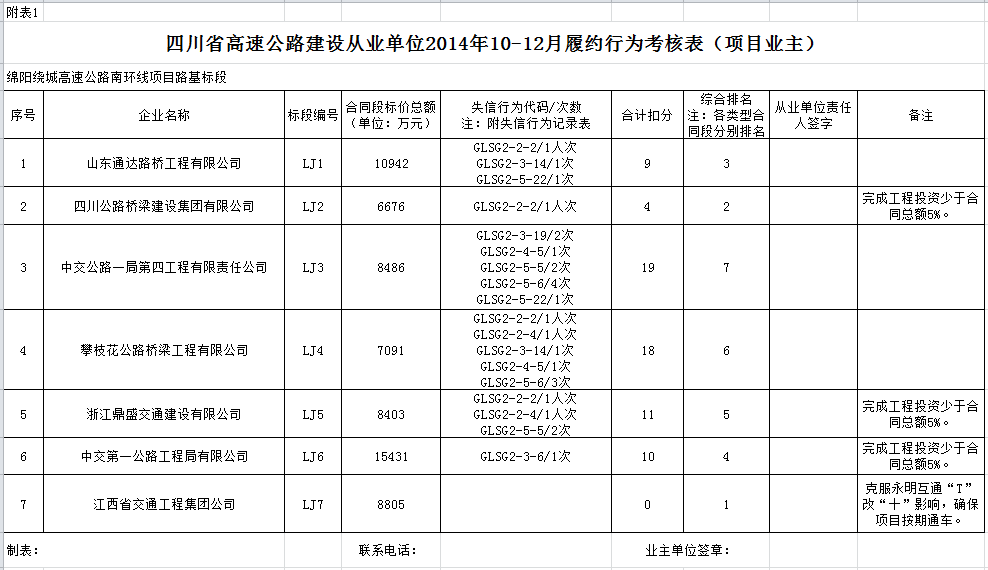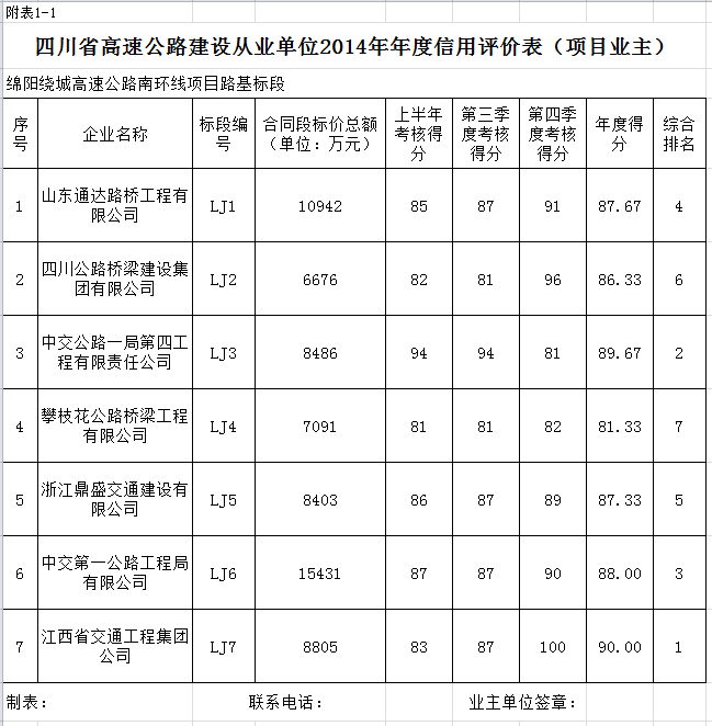 綿陽繞城高速公路南環(huán)線建設路基單位2014年年度信用評價和2014年第四季度履約行為考核結果公示