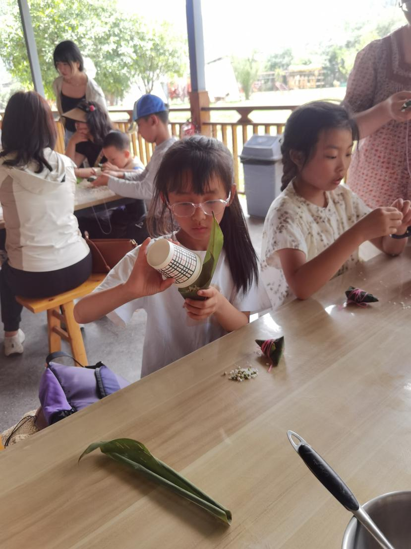 粽葉飄香傳古韻,巧手編織愛國情。在氤氳的茶香尚未散去時,一場別開生面的端午包粽活動又將親子互動的暖意推向高潮。孩子們圍坐在鋪滿青綠粽葉的木桌前,聆聽志愿者講述屈原的愛國故事與端午習(xí)俗,稚嫩的臉龐上寫滿對傳統(tǒng)文化的向往。家長手把手教孩子將糯米與紅豆填入粽葉,折葉、纏線、打結(jié),每一個步驟都流淌著千年的文化血脈。當(dāng)棱角分明的粽子在孩子們掌心誕生時,他們不僅學(xué)會了傳統(tǒng)技藝,更在粽葉的清香中觸摸到“家國情懷”的深刻內(nèi)涵?;顒蝇F(xiàn)場,五彩絲線纏繞的粽子與茶園蒼翠相映成趣,愛國精神與文化傳承如同粽米般緊密相融,在親子協(xié)作間代代相傳。