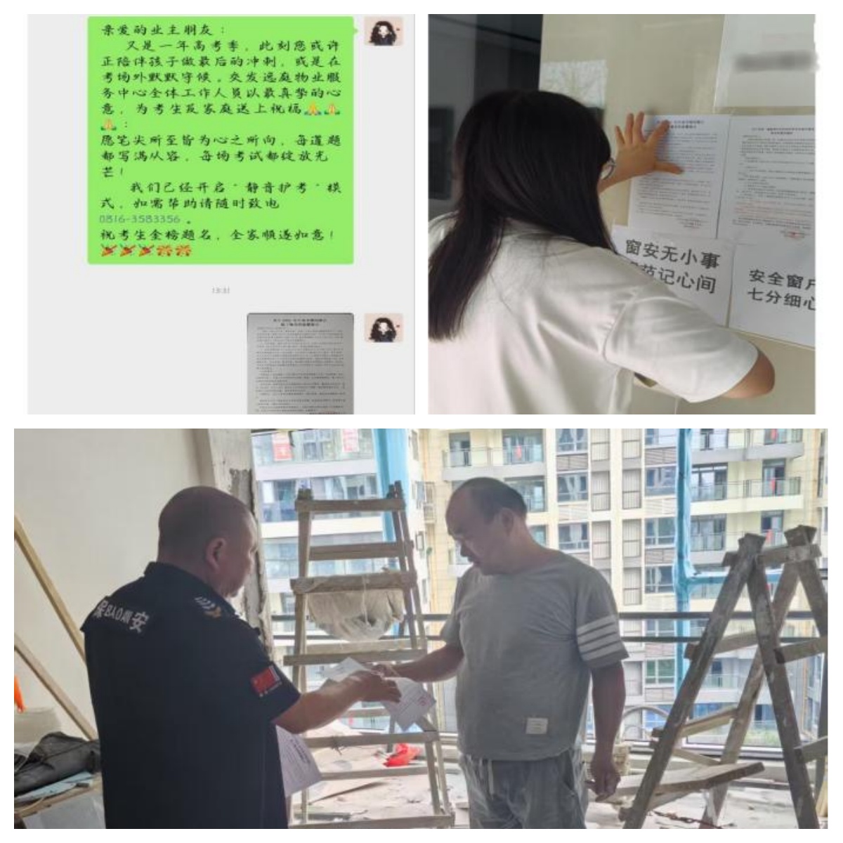 溫情服務(wù),撐起安心傘。交發(fā)實業(yè)多措并舉開展“溫情護考”物業(yè)行動,安排專人24小時值守監(jiān)控室并增加小區(qū)巡邏頻次,重點關(guān)注人員活動、車輛通行等情況,及時發(fā)現(xiàn)可能產(chǎn)生噪音源,做到早發(fā)現(xiàn)、早協(xié)調(diào)、早解決;積極主動與裝修業(yè)主和小區(qū)底商溝通,逐一上門發(fā)放《禁噪告知書》,同時通過業(yè)主微信群、朋友圈、小區(qū)公告欄、電梯轎廂等線上線下渠道發(fā)布《靜音倡議書》,呼吁全體業(yè)主攜手開啟“靜音模式”,為小區(qū)考生打造安靜、和諧、溫馨的備考環(huán)境。