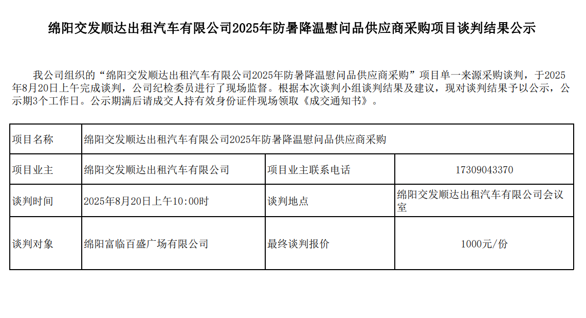 綿陽交發(fā)順達出租汽車有限公司2025年防暑降溫慰問品供應(yīng)商采購項目談判結(jié)果公示